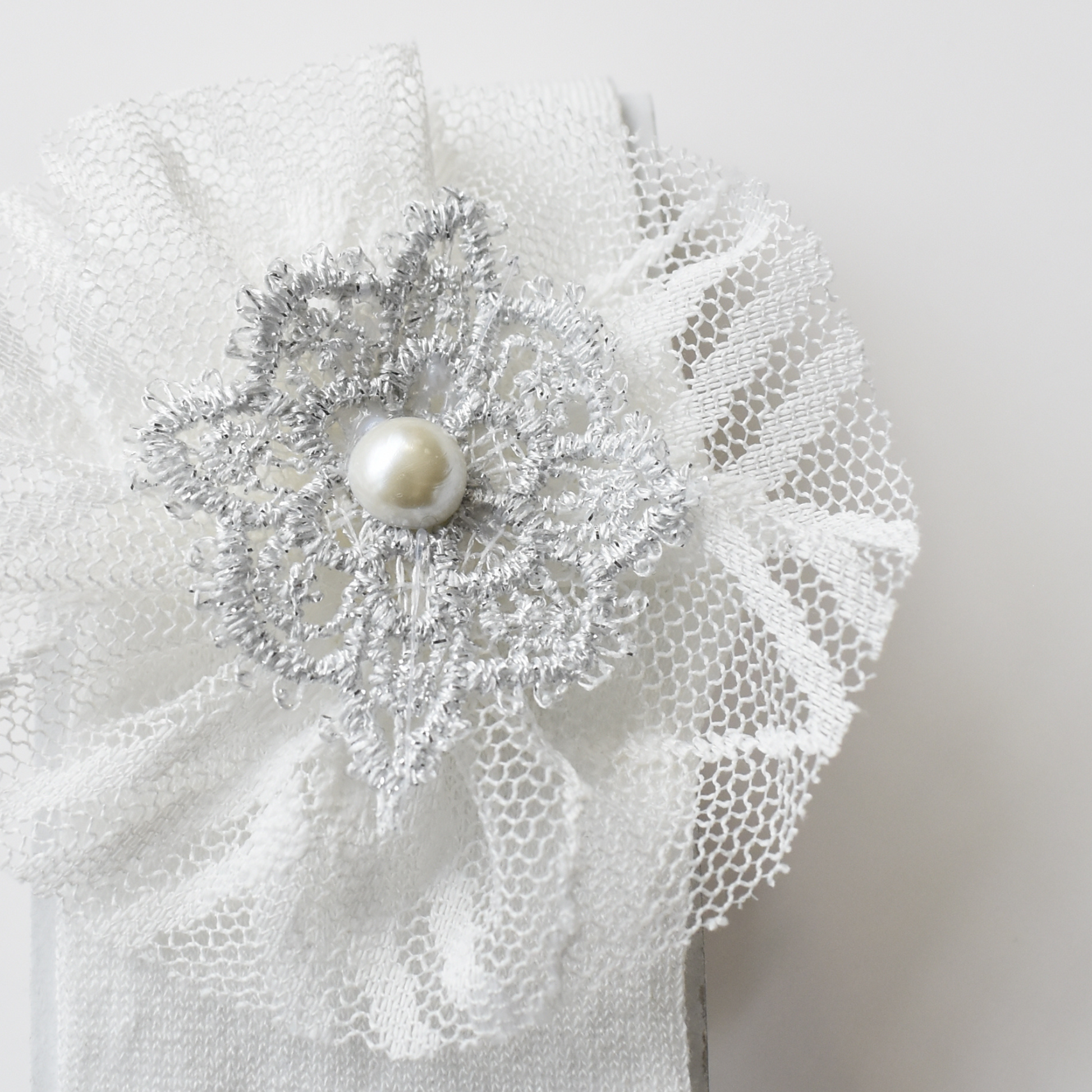 Delightful ensemble featuring soft baby shoes, a matching headband, and cozy tights, all featuring a shiny patch with a delicate pearl, adding a touch of elegance to your little one's ensemble.